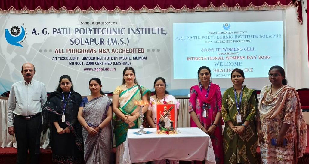 सोलापूर : विजापूर रोड सोलापूर येथील ए. जी. पाटील पॉलिटेक्निक इन्स्टिट्यूट मध्ये महिला दिनाचे औचित्य साधून महाविद्यालयात कार्यरत जागृती महिला मंचच्या वतीने डॉक्टर शालिनी मस्के यांचे “योग, आहार व विहार” या विषयावरती व्याख्यानाचे आयोजन करण्यात आले होते. डॉक्टर शालिनी मस्के या प्रमुख वक्त्या कार्यक्रमाला प्रमुख पाहुणे म्हणून उपस्थित होत्या. या कार्यक्रमाला प्रथम, द्वितीय व तृतीय वर्षातील विद्यार्थिनी आणि महाविद्यालयातील सर्व महिला स्टाफ उपस्थित होते. कार्यक्रमाची सुरुवात दीप प्रज्वलनाने करण्यात आली. यावेळी व्यासपीठावर संस्थेचे कॅम्पस डायरेक्टर व महाविद्यालयाचे प्राचार्य डॉ. एम ए चौगुले, प्रमुख वक्ते डॉक्टर शालिनी मस्के व जागृती महिला विचार मंचाच्या समन्वयक सौ लक्ष्मी बिराजदार होते.