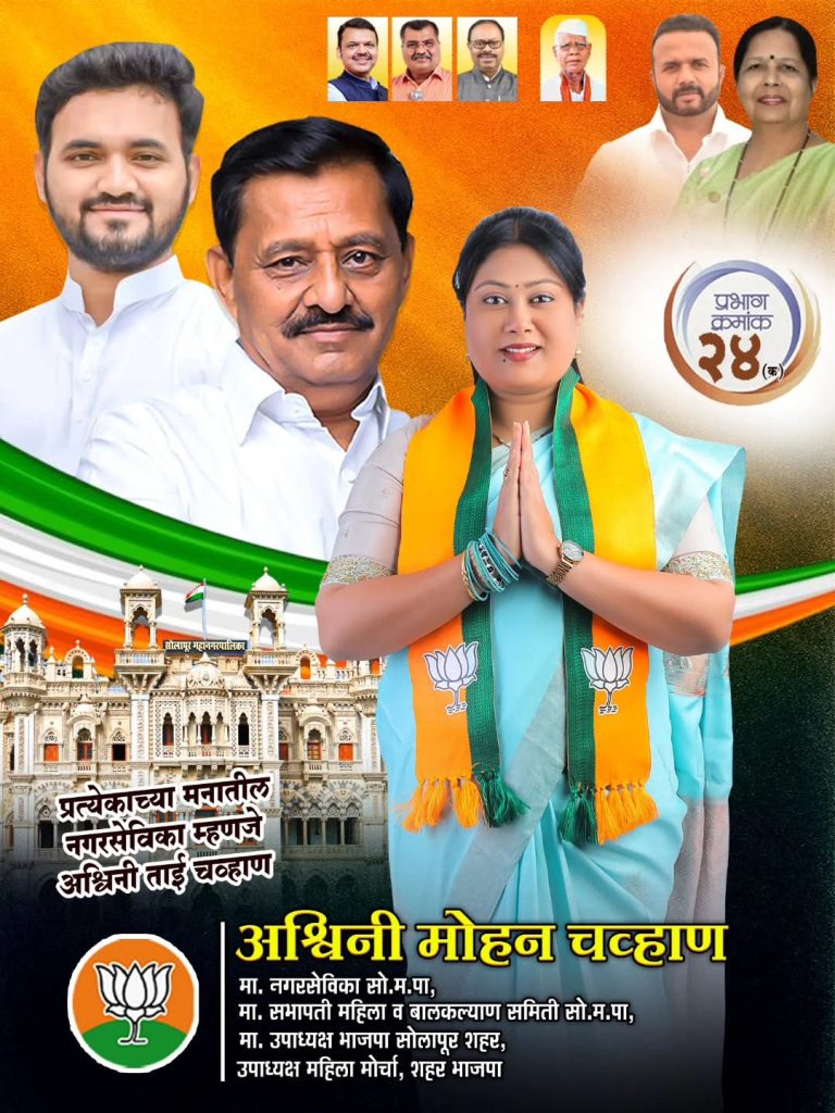 सोलापूर: सोलापूर महानगरपालिका निवडणूक २०२६ चे बिगुल वाजल्यापासून शहरात राजकीय वातावरण चांगलेच तापले आहे. प्रभाग क्रमांक २४ च्या भाजप उमेदवार अश्विनी मोहन चव्हाण यांनी प्रचारात मोठी आघाडी घेतली असून, त्यांना नागरिकांकडून उस्फूर्त प्रतिसाद मिळत असल्याचे चित्र दिसत आहे.