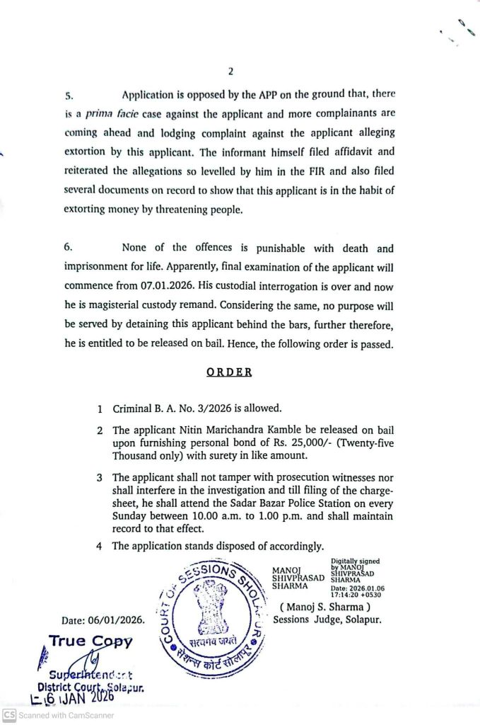 सोलापूर – शिवभोजन योजनेतील हॉटेल व्यावसायिकाकडून 2,44,500/- रुपयांची खंडणी घेतल्या प्रकरणी सदर बझार पोलीस स्टेशन येथील गुन्हा रजिस्टर नंबर 1050 / 2025 या गुन्ह्यातील अटकेतील आरोपी / पत्रकार नितीन कांबळे यांस प्रमुख जिल्हा व सत्र न्यायाधीश मनोज शर्मा साहेबांनी 25000/ रुपयांच्या जामीनावर सोडण्याचे आदेश केले आहेत.