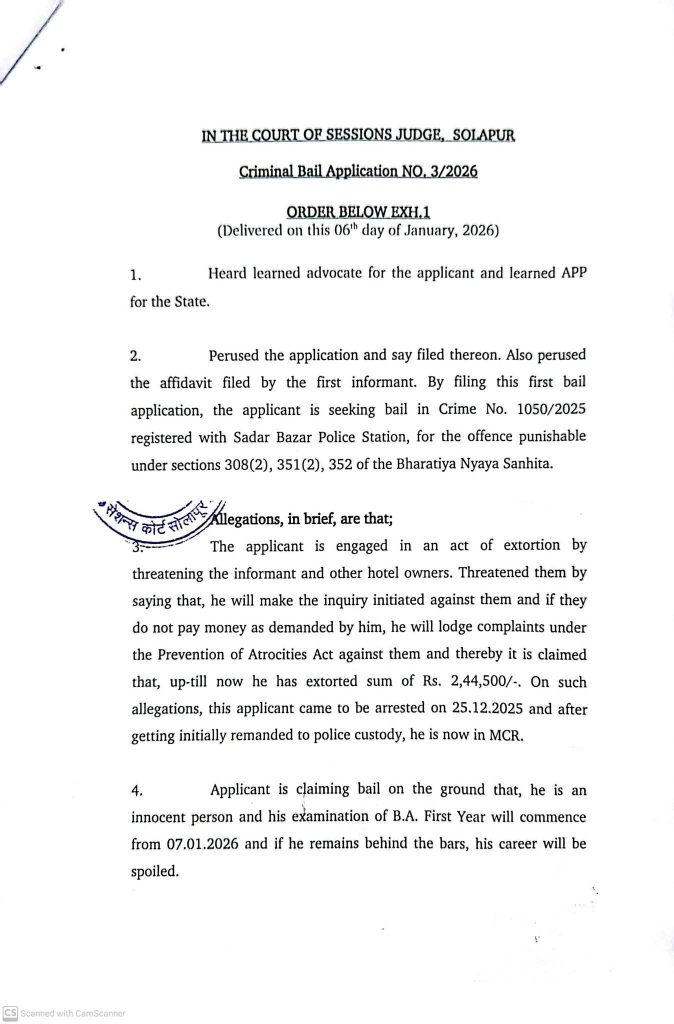 यात सविस्तर हकीकत अशी की, शिवभोजन चालक तथा हॉटेल समताचे इरफान शेख व अन्य शिवभोजन चालकांविरुद्ध तक्रारी अर्ज करून आणि अट्रॉसिटीची केसची धमकी देऊन रोख व फोन पे च्या माध्यमातून खंडणी घेतल्याच्या गुन्ह्यात नितीन कांबळे यांस 25/12/2025 रोजी पोलिसांनी अटक केली होती. त्या गुन्ह्यात आरोपीस जामीन मिळावा, म्हणून ॲड. योगेश नागनाथ पवार यांनी जिल्हा न्यायालयात जामीन अर्ज दाखल केला होता. त्या जामीन अर्जाला सरकारी वकील कुरुडकर यांनी व मूळ फिर्यादीने जोरदार विरोध केला. परंतु, आरोपीचे वकील ॲड. योगेश पवार यांनी केलेला युक्तिवाद ग्राह्य धरून प्रमुख जिल्हा व सत्र न्यायाधीश मनोज शर्मा साहेबांनी आरोपीस जामीन मंजूर केला. यात आरोपीतर्फे ॲड. योगेश नागनाथ पवार आणि ॲड. दिपाली सचिन गायकवाड यांनी काम पाहिले.