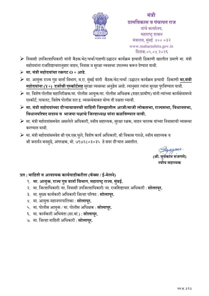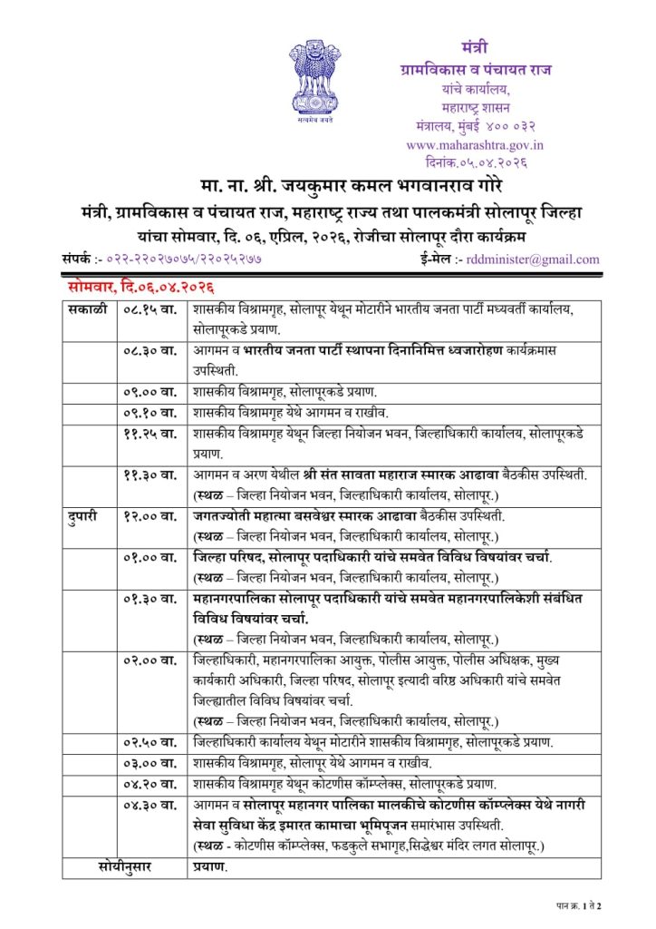 सोमवारी सकाळी ८.१५ वाजता ते भाजपच्या मध्यवर्ती कार्यालयात येणार असून स्थापना दिनानिमित्त ध्वजारोहण कार्यक्रमास उपस्थित राहणार आहेत. त्यानंतर नियोजन भवनात सकाळी ११.३० वाजता अरण (ता. माढा) येथील श्री संत सावता महाराज स्मारकाची आढावा बैठक होणार आहे. दुपारी १२ वाजता मंगळवेढ्यातील जगतज्योती महात्मा बसवेश्वर स्मारकाची आढावा बैठक घेण्यात येणार आहे.दुपारी १ वाजता जयकुमार गोरे जिल्हा परिषदेच्या पदाधिकाऱ्यांसोबत नियोजन भवनात विविध विषयांवर चर्चा होणार आहे. त्यानंतर दुपारी १.३० वाजता महापालिका पदाधिकाऱ्यांसोबतही तेथेच चर्चा केली जाणार आहे. दुपारी २ वाजता जिल्हाधिकारी एस. कार्तिकेयन, महापालिका आयुक्त डॉ. सचिन ओम्बासे, पोलिस आयुक्त एम. राजकुमार, पोलिस अधीक्षक अतुल कुलकर्णी, जिल्हा परिषदेचे मुख्य कार्यकारी अधिकारी कुलदिप जंगम यांच्यासोबत जिल्ह्यातील विविध विषयांवर चर्चा होणार आहे. दुपारी ३ ते ४ हा वेळ त्यांनी शासकीय विश्रामगृहात राखीव ठेवला आहे. दुपारी ४.३० वाजता महापालिकेच्या सेवा सुविधा केंद्र इमारतीच्या भूमिपूजन समारंभास कोटणीस कॉम्प्लेक्स येथे ते उपस्थित राहणार आहेत