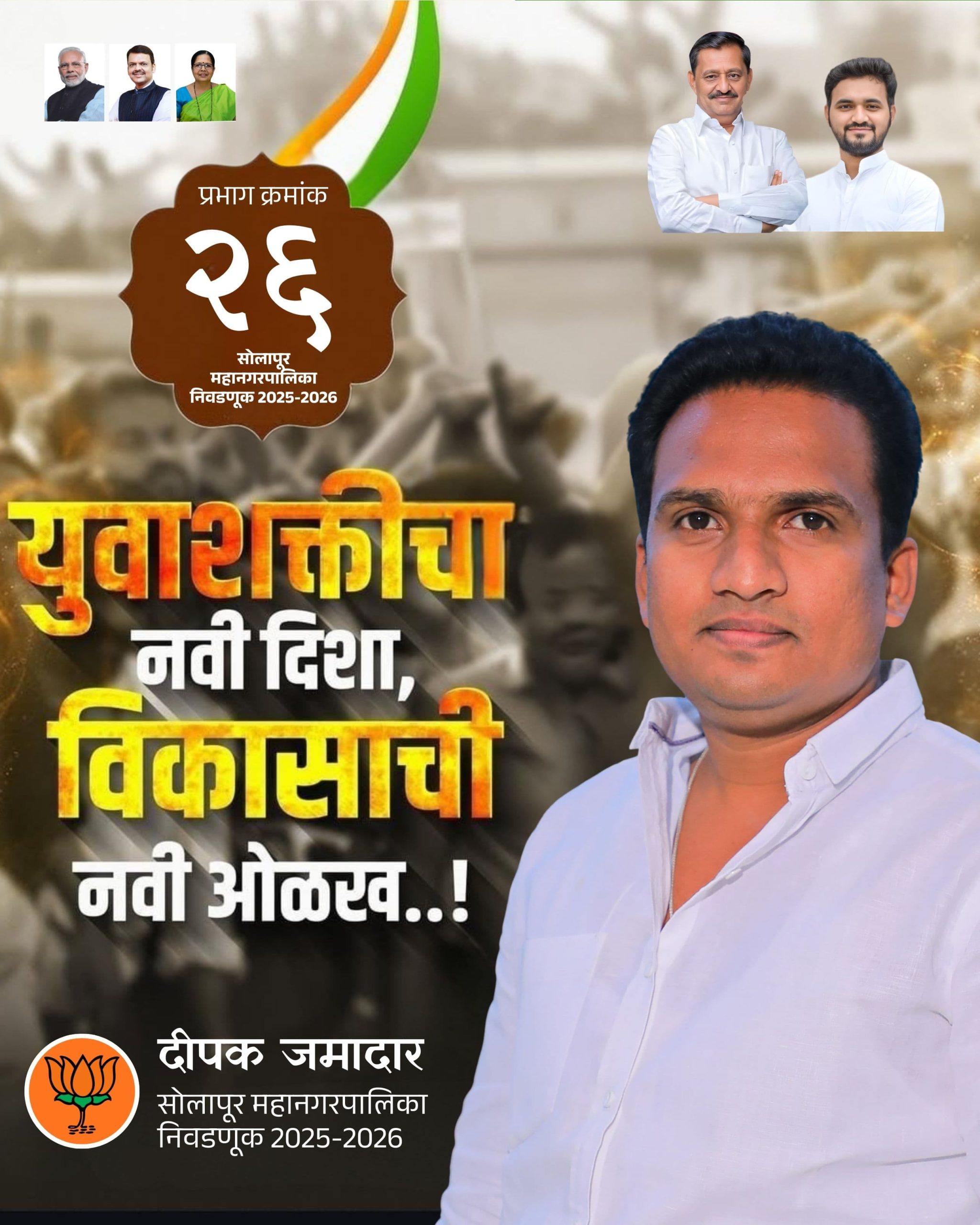 सोलापूर: सोलापूर महानगरपालिका निवडणुकीचे वारे वाहू लागले असून, प्रभाग क्रमांक २६ मधील राजकीय वातावरण चांगलेच तापले आहे. भारतीय जनता पक्षाचे तरुण आणि तडफदार उमेदवार दीपक जमादार यांच्या प्रचार दौऱ्याला प्रभागातील कानाकोपऱ्यातून अभूतपूर्व प्रतिसाद मिळत असल्याचे चित्र पाहायला मिळत आहे.