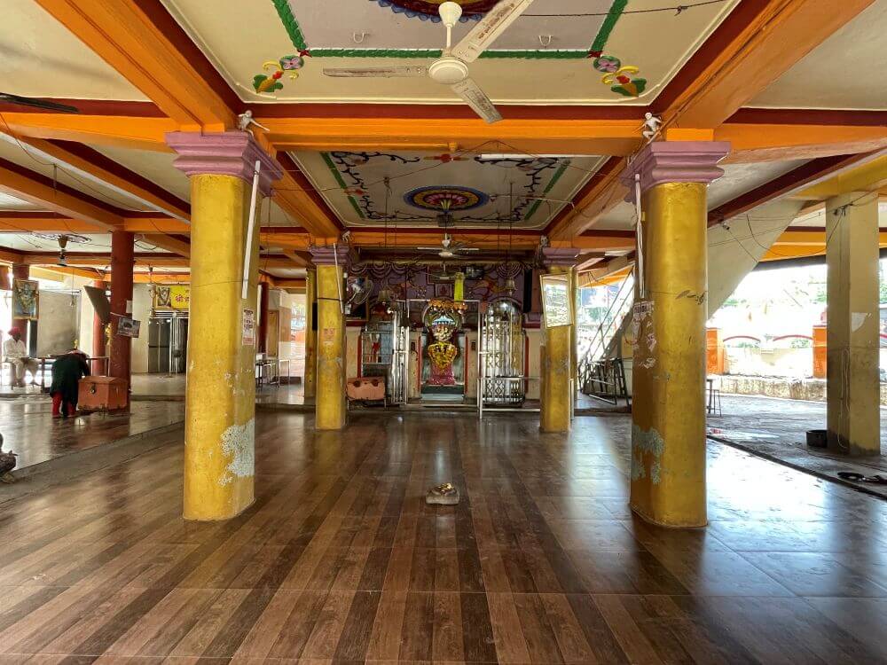 पुढे खुल्या स्वरूपाचा सभामंडप आहे. सभामंडपात प्रत्येकी चार गोलाकार स्तंभांच्या चार रांगा आहेत. स्तंभांवर तुळई व त्यावर छत आहे. छताला पितळी घंटा टांगलेल्या आहेत. वितानावर चक्राकार नक्षी आहे. सभामंडपापुढे गर्भगृह आहे. गर्भगृहात जमिनीवर मध्यभागी सीताराम महाराजांचे समाधी स्थान व मागील मखरात महाराजांची ध्यानमुद्रेतील मूर्ती आहे. मंदिराच्या छतावर चारही कोनांवर चार लघूशिखरे आहेत. त्यावर प्रत्येकी दोन आमलक व कळस आहेत. छतावर मध्यभागी मुख्य शिखर सुमारे वीस फूट उंचीचे आहे. त्यावर या गोलाकार शिखरावर स्तंभनक्षी आहे. शिखराच्या शीर्षभागी एकावर एक असे दोन आमलक व कळस आहेत.