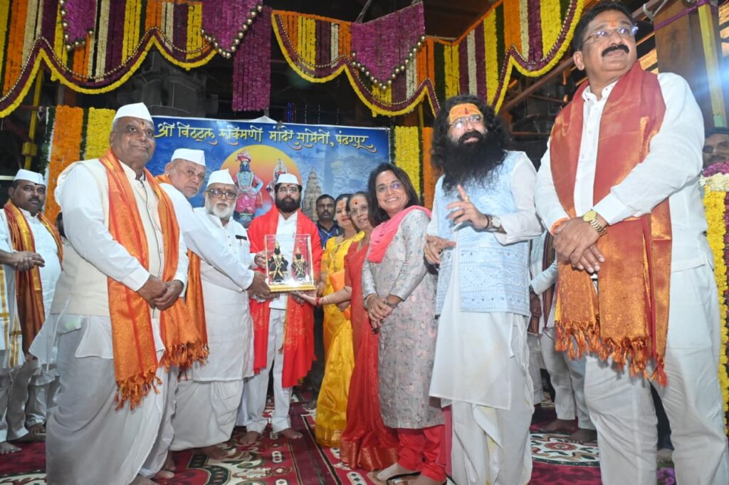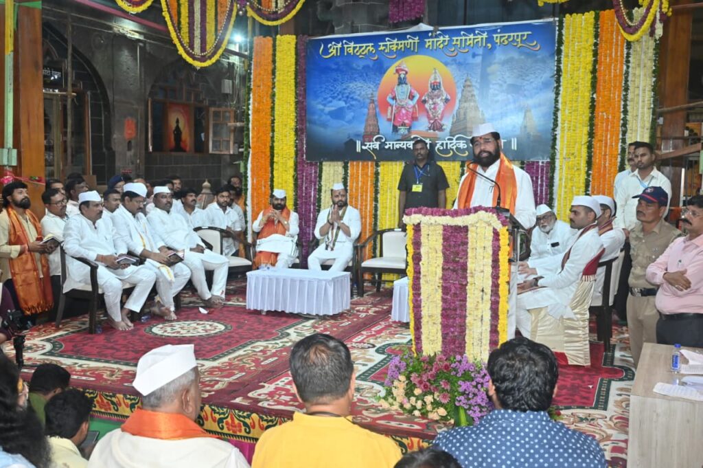 कार्तिकी यात्रा 2025च्या अनुषंगाने श्री विठ्ठल रुक्मिणीची शासकीय महापूजा उपमुख्यमंत्री श्री. एकनाथ शिंदे व मानाचे वारकरी रामराव वालेगावकर यांच्या हस्ते सपत्नीक संपन्न झाली. यावेळी मंदिर समितीच्या वतीने करण्यात आलेल्या सत्कार प्रसंगी श्री. एकनाथ शिंदे बोलत होते. यावेळी पालकमंत्री जयकुमार गोरे, फलोत्पादन मंत्री भरत गोगावले, खासदार श्रीकांत शिंदे, आमदार सर्वश्री समाधान आवताडे, अभिजीत पाटील, तानाजी सावंत, बापूसाहेब पठारे, जिल्हाधिकारी कुमार आशीर्वाद, मुख्य कार्यकारी अधिकारी कुलदीप जंगम, पोलीस अधीक्षक अतुल कुलकर्णी, मंदिर समितीचे सह अध्यक्ष गहिनीनाथ महाराज औसेकर व समिती सदस्य तसेच समितीचे कार्यकारी अधिकारी राजेंद्र शेळके व मान्यवर उपस्थित होते.