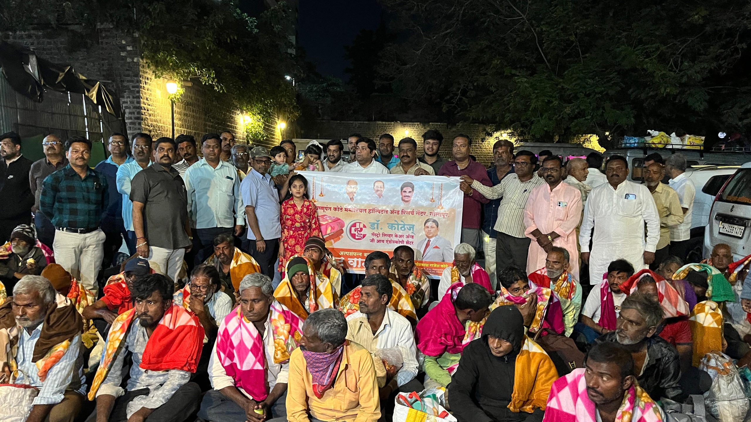 सोलापूर : स्व. विष्णुपंत (तात्यासाहेब) कोठे मेमोरियल ट्रस्ट संचलित डॉ. कोठेज् हॉस्पिटल यांच्या वतीने प्रसिब्द गॅस्ट्रोएंटेरोलॉजिस्ट डॉ. सूर्यप्रकाश राजेश कोठे यांच्या मार्गदर्शनाखाली ग्रामदैवत श्री शिवयोगी सिब्दरामेश्वर मंदिर परिसरातील गोरगरीब व बेघर नागरिकांना कुमारी कौशिका सूर्यप्रकाश कोठे यांच्या वाढदिवसाचे औचित्य साधून शाली व ब्लॅकेटचे वाटप करण्यात आले.