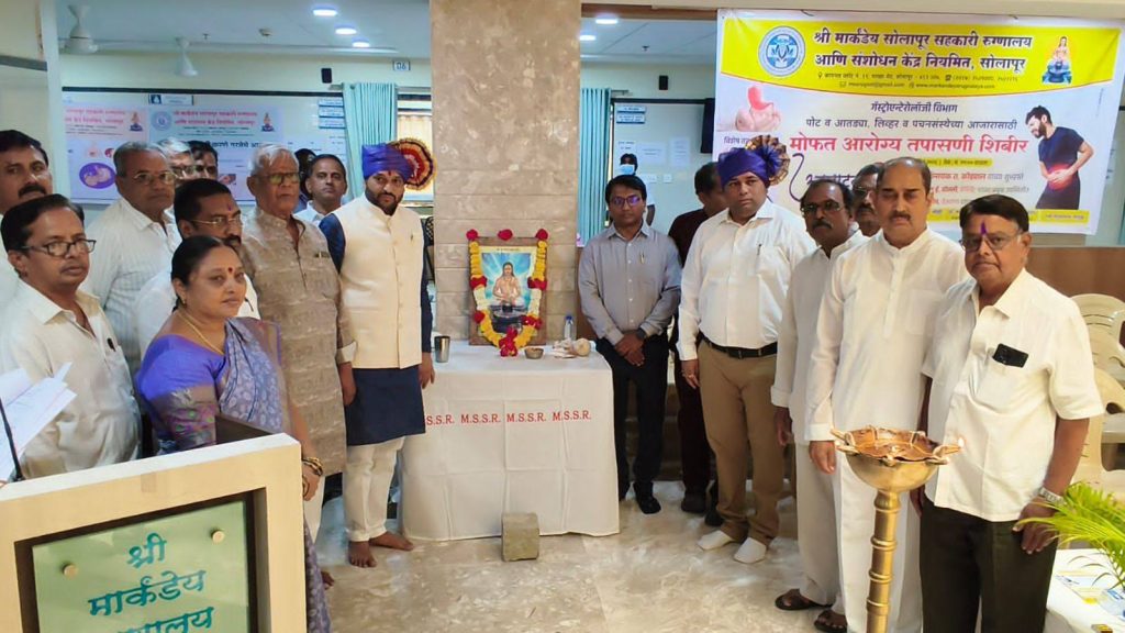 सोलापूर – भारतरत्न डॉ. बाबासाहेब आंबेडकर यांच्या जयंतीनिमित्त सामाजिक बांधिलकीचा आदर्श जपत श्री मार्कंडेय सोलापूर सहकारी रुग्णालय व संशोधन केंद्र, सोलापूर यांच्या गॅस्ट्रोएन्टेरोलॉजी विभागाच्या वतीने पोट, आतडे, लिव्हर व पचनसंस्थेशी संबंधित आजारांसाठी मोफत आरोग्य तपासणी शिबिराचे प्रभावी आयोजन करण्यात आले मार्कंडेय रुग्णालयातील ओपीडी हॉल येथे पार पडलेल्या या शिबिराचे उद्घाटन महापौर विनायक कोंडयाल यांच्या हस्ते दीपप्रज्वलन करून करण्यात आले. यावेळी रुग्णालयाचे प्रेसिडेंट सत्यनारायण बोल्ली, चेअरमन डॉ. माणिक गुर्रम, संचालक डॉ. विजयकुमार आरकाल, अशोक आडम, लक्ष्मीनारायण कुचन, रायेशम येमुल, मनोहर अन्नलदास, पार्वतय्या श्रीराम, कमटम सर, माजी महापौर श्रीकांचना यन्नम, किसन श्रीराम, डॉ. श्रीकांत माकम, डॉ. अभिजीत चिंचोली आदी मान्यवरांची उपस्थिती लाभली.