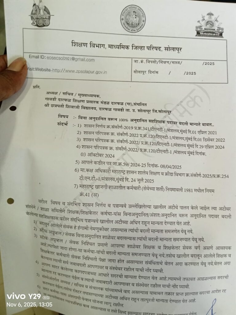 मुटकुळे हे गावडी दारफळ येथील श्री. छत्रपती विद्यालयात 13 जून 2006 पासून विनाअनुदानित तत्त्वावर काम करत होते. 15 ऑगस्ट 2009 रोजी त्यांना वैयक्तिक मान्यताही मिळाली होती. संस्थेने त्यांना शंभर टक्के अनुदान तुकडीवर 15 ऑक्टोबर 2024 रोजी बदलीचा प्रस्ताव दिला होता. शिक्षणाधिकारी जगताप यांनी हा प्रस्ताव मान्य करीत त्यांना बदलीच्या ठिकाणी नियुक्ती दिली आहे.