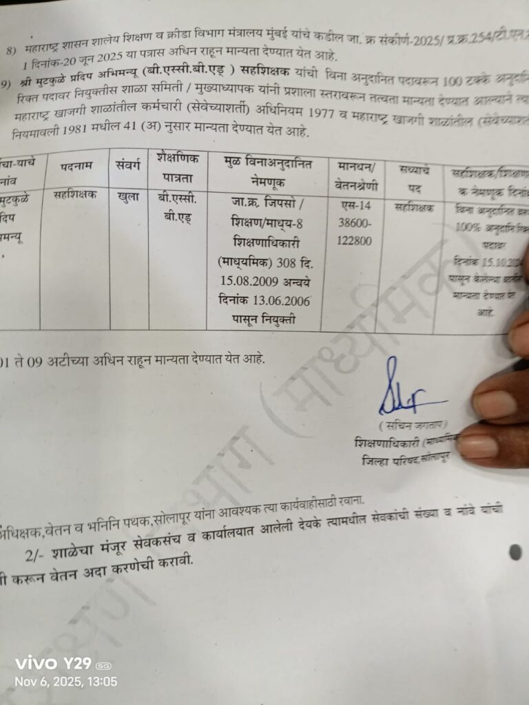 सोलापूर : सोलापूरचे माध्यमिक शिक्षणाधिकारी सचिन जगताप हे वेगवेगळ्या कारणांनी नेहमीच चर्चेत असतात. अन्यायग्रस्त शिक्षकांना न्याय देण्यासाठी यापूर्वी त्यांनी शिक्षण संस्थांमध्ये जाऊन ठाण मांडल्याच्या घटना ताज्या आहेत. पगार नसल्याने एका शिक्षकाची पत्नी माहेरी निघून गेल्याचे कळताच चक्क माध्यमिक शिक्षणाधिकारी सचिन जगताप यांनी “त्याची शिक्षकाच्या सासर्याला कॉल केल्याची घटना गुरुवारी सकाळी माध्यमिक शिक्षण कार्यालयात घडली. त्यामुळे उपस्थितांबरोबरच त्या शिक्षकाला गहिवरून आले.