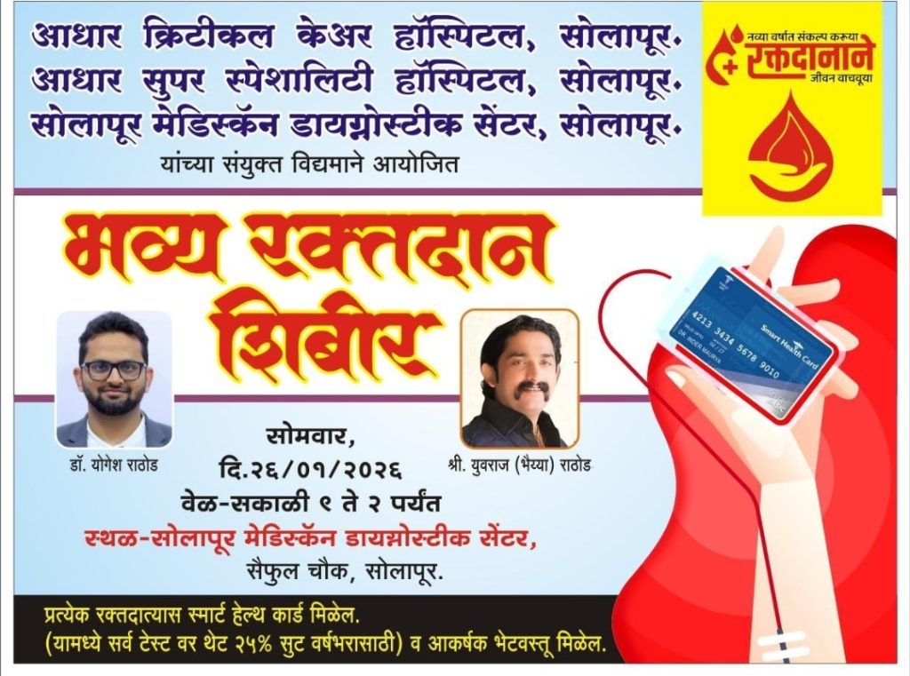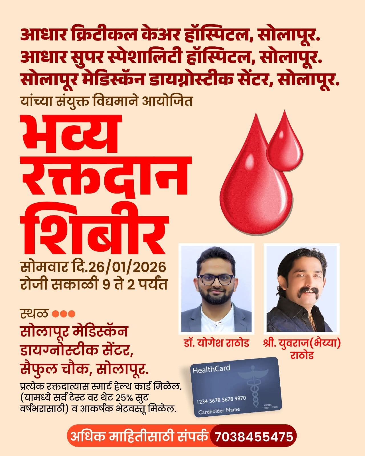 हे शिबीर सोमवार, दि. २६ जानेवारी २०२६ रोजी पार पडणार असून, याद्वारे गरजू रुग्णांसाठी रक्ताचा साठा उपलब्ध करून देण्याचा मानस आयोजकांनी व्यक्त केला आहे. हे शिबीर उद्या सकाळी ९:०० ते दुपारी २:०० वाजेपर्यंत सुरू राहील. शिबिराचे आयोजन . डॉ योगेश राठोड आणि युवराज (भैया) राठोड तसेच सोलापूर मेडिस्कॅन डायग्नोस्टिक सेंटर यांनी केले आहे. परिसरातील जास्तीत जास्त नागरिकांनी या शिबिरात सहभागी व्हावे, असे ही आवाहन करण्यात आले आहे…
