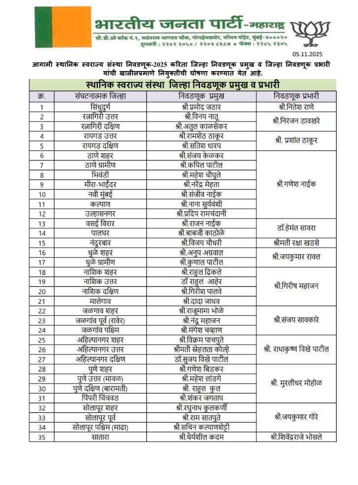 सोलापूर : जिल्हा परिषद, नगर पालिका, महापालिका निवडणुकीची जबाबदारी भाजपने निश्चित केली आहे. सोलापूर जिल्ह्याचे प्रभारी म्हणून पालकमंत्री जयकुमार गोरे यांच्याकडे मुख्य जबाबदारी देण्यात आली. महापालिका निवडणुकीची जबाबदारी रघुनाथ कुलकर्णी यांच्याकडे दिली आहे. २०१७ मध्ये त्यांच्याकडे जबाबदारी असताना भाजपने यश मिळवले होते. सोलापूर पूर्वची जबाबदारी माजी आमदार राम सातपुतेंकडे तर पश्चिमची (माढा) जबाबदारी आमदार सचिन कल्याणशेट्टी यांच्याकडे देण्यात आली आहे. भाजपा प्रदेशध्यक्ष रवींद्र चव्हाण यांनी जबाबदारी सोपवली. सन २०१७ मध्ये महापालिका निवडणुकीत शरद कुलकर्णी हे प्रभारी होते. त्यांनी पालिकेत सत्ता आणली. आता त्यांच्याकडे पुन्हा जबाबदारी देण्यात आली.