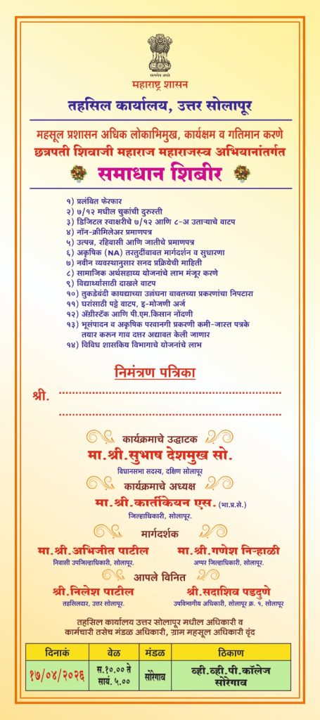 त्याअनुषंगाने उत्तर सोलापूर तालुक्यातील सोरेगांव व वडाळा मंडळ स्तरावर शुक्रवार दिनांक 17 एप्रिल 2026 रोजी सकाळी 10.00 ते सायंकाळी 5.00 या वेळेत समाधान शिबिराचे आयोजन करणेत आले आहे.तसेच या कार्यक्रमास मा. जिल्हाधिकारी, मा. अपर जिल्हाधिकारी, मा. निवासी उपजिल्हाधिकारी, सोलापूर मा. आमदार महोदय उपस्थित राहणार आहेत. असे तहसिलदार उत्तर सोलापूर निलेश पाटील यांनी प्रसिध्दीपत्रकाद्वारे कळविले आहे.