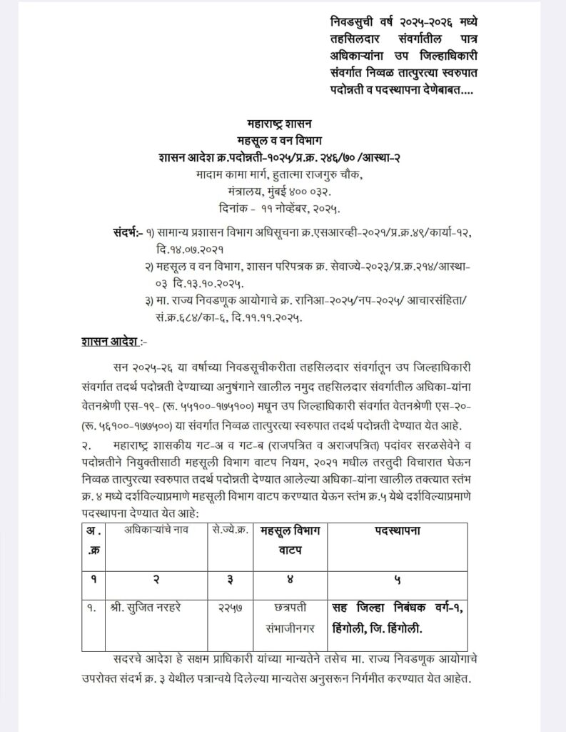 सोलापूर ; मंद्रूप अप्पर तहसीलचे तहसीलदार सुजित नरहरे यांना पदोन्नती मिळाले असून त्यांची हिंगोली येथे सह जिल्हा निबंधक या पदावर नियुक्ती करण्यात आली आहे. तहसीलदार नरहरे यांनी दीड वर्षापूर्वी मंद्रूप अप्पर तहसीलचा पदभार घेतला होता. या काळात शेतकरी नुकसानभरपाई , शेतरस्ते, अवैद्य मुरूम व वाळू उपसा या क्षेत्रात उल्लेखनीय कार्य केला आहे. तहसीलदार नरहरे यांनी यापूर्वी नांदेड, लातूर, धाराशिव व तुळजापूर यासह इतर ठिकाणी तहसीलदार म्हणून कामकाज केला आहे. दोन वर्षापासून ते पदोन्नतीच्या प्रतीक्षेत होते. अखेर शासनाने तहसीलदारांना उपजिल्हाधिकारी पदाचे पदोन्नती दिल्याने सुजित नरहरे यांची सह जिल्हा निबंधक पदी नियुक्ती करण्यात आली आहे.