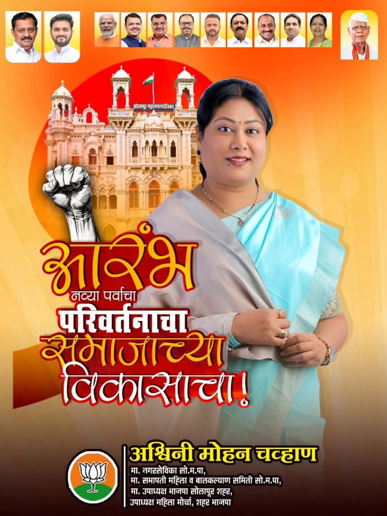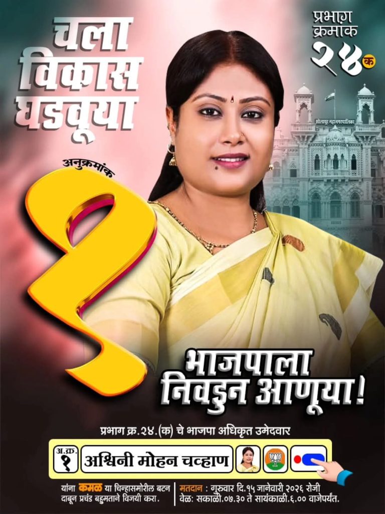 ​सोलापूर: सोलापूर महानगरपालिका निवडणूक २०२६ चे बिगुल वाजले असून, प्रभाग क्रमांक २४ ‘क’ मधून भारतीय जनता पार्टीच्या अधिकृत उमेदवार अश्विनी मोहन चव्हाण यांच्या प्रचाराने वेग घेतला आहे. “संयम, सभ्यता आणि प्रगतीचे प्रतीक” अशी ओळख निर्माण केलेल्या अश्विनी चव्हाण यांना प्रभागातील घराघरांतून उत्स्फूर्त प्रतिसाद मिळत असून, त्यांच्या पदयात्रेत नागरिकांचा जनसागर लोटताना दिसत आहे.​