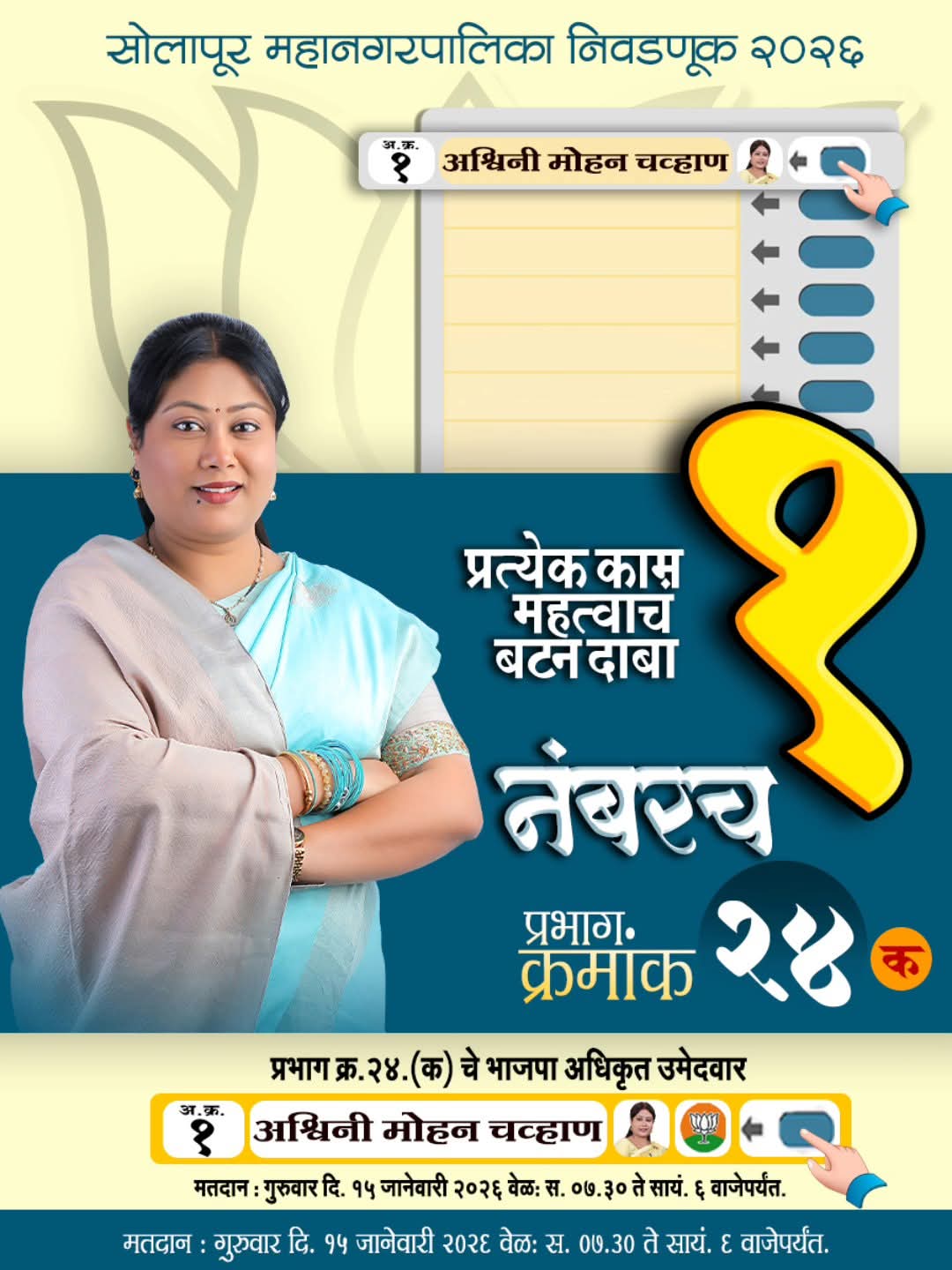 ​सोलापूर: सोलापूर महानगरपालिका निवडणूक २०२६ चे बिगुल वाजले असून, प्रभाग क्रमांक २४ ‘क’ मधून भारतीय जनता पार्टीच्या अधिकृत उमेदवार अश्विनी मोहन चव्हाण यांच्या प्रचाराने वेग घेतला आहे. “संयम, सभ्यता आणि प्रगतीचे प्रतीक” अशी ओळख निर्माण केलेल्या अश्विनी चव्हाण यांना प्रभागातील घराघरांतून उत्स्फूर्त प्रतिसाद मिळत असून, त्यांच्या पदयात्रेत नागरिकांचा जनसागर लोटताना दिसत आहे.​