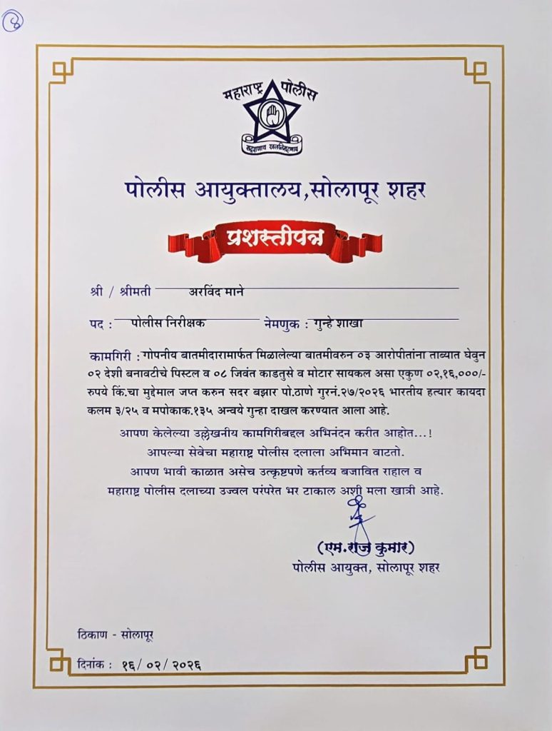 सोलापूर : शहरात उल्लेखनीय कामगिरीबद्दल सोलापूर शहराचे पोलीस आयुक्त एम. राज कुमार यांनी पोलीस निरीक्षक अरविंद माने आणि त्यांच्या पथकाचे विशेष कौतुक केले आहे. त्यांना ‘प्रशस्तीपत्र’ देऊन सन्मानित करण्यात आले. “महाराष्ट्र पोलीस दलाला आपल्या सेवेचा अभिमान वाटतो. भविष्यातही आपण अशाच प्रकारे उत्कृष्ट कर्तव्य बजावून पोलीस दलाच्या उज्ज्वल परंपरेत भर घालाल, अशी खात्री आहे,” अशा शब्दांत आयुक्तांनी त्यांच्या पाठीवर शाबासकीची थाप दिली आहे.