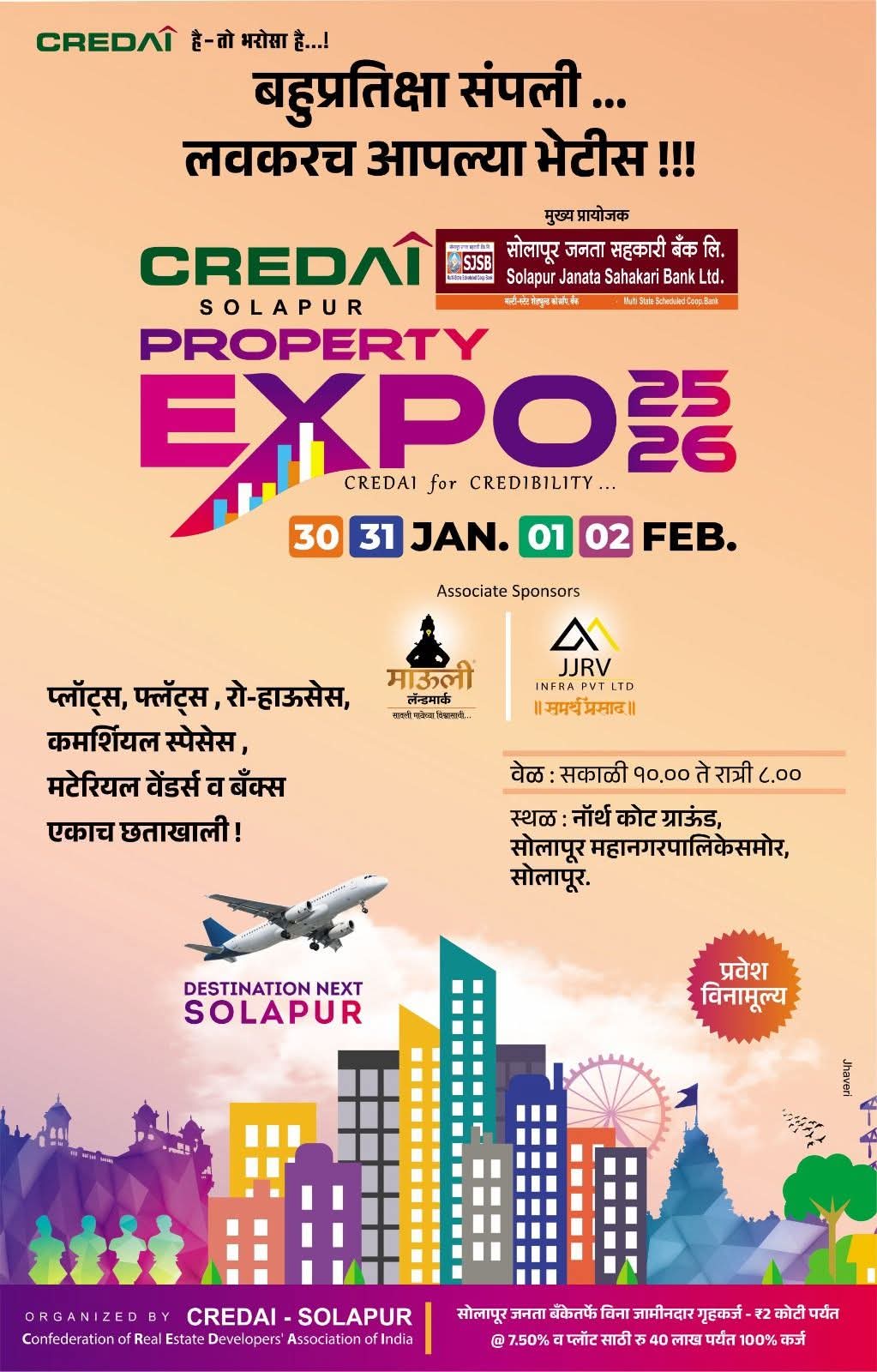 सोलापूर : क्रेडाई सोलापूर तर्फे प्लॉट,फ्लॅटस्, रो हाऊझेस् , बिल्डिंग मटेरियल सप्लायर्स , वित्तीय संस्था इत्यादीचे प्रॉपर्टी expo प्रदर्शन यंदा दि. ३० जानेवारी ते २ फेब्रुवारी दरम्यान नॉर्थ कोट हायस्कुल ग्राऊंड येथे आयोजीत करण्यात आले असल्याची माहिती क्रेडाई सोलापूरचे अध्यक्ष अभिनव साळुंखे यांनी पत्रकार परीषदेत दिली. याचे उद्घाटन शुक्रवार ३० जानेवारी रोजी माजी सनदी अधिकारी व मुख्यमंत्र्यांचे आर्थिक सल्लागार प्रवीणसिंह परदेशी यांच्या शुभहस्ते व सोलापूर जनता बँकेचे चेअरमन सुनील पेंडसे यांच्या अध्यक्षतेखाली संपन्न होणार आहे. ह्याप्रसंगी क्रेडाई नॅशनलचे सदस्य सुनिल फुरडे, क्रेडाई महाराष्ट्राचे उपाध्यक्ष शशिकांत जिद्दीमनी यांची प्रमुख उपस्थिती असणार आहे. सोमवार दि. २ फेब्रुवारी पर्यंत दररोज स. १० ते रात्रौ ८ दरम्यान सर्वांसाठी हे प्रदर्शन खुले असणार आहे. क्रेडाई सोलापूर आयोजीत या प्रदर्शनाचे सोलापूर जनता सह बँक हे मुख्य प्रायोजक असून माऊली लँडमार्क व जेजेआरव्ही समर्थ प्रसाद हे सह प्रायोजक आहेत .