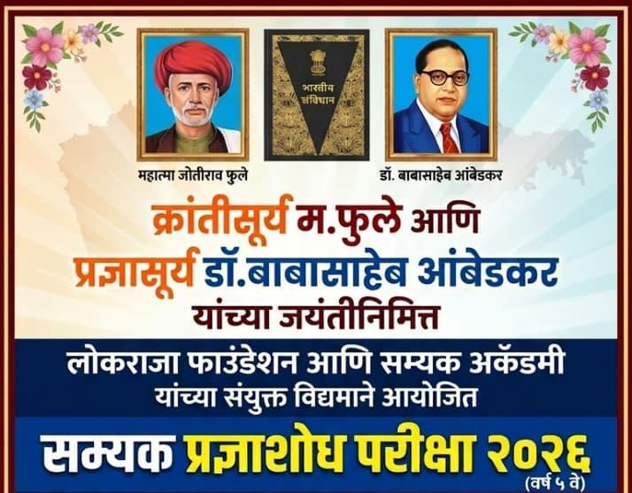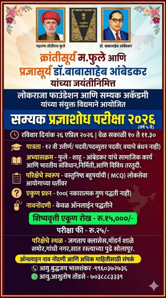 सोलापूर : क्रांतिसूर्य म. फुले आणि प्रज्ञासुर्य डॉ. बाबासाहेब आंबेडकर यांच्या संयुक्त जयंतीनिमित्त सम्यक अकॅडमी आणि लोकराजा फाउंडेशन यांच्या संयुक्त विद्यमाने सम्यक प्रज्ञा शोध परीक्षेचे रविवार दिनांक २६ एप्रिल २०२६ रोजी सकाळी १० वाजता आयोजन केले असल्याची माहिती राज्यकर निरीक्षक बुद्धजय भालशंकर यांनी दिली.