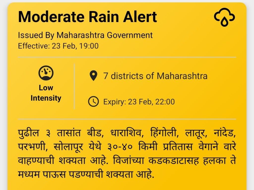 सोलापूर : २३ फेब्रुवारी २०२६ महाराष्ट्र शासनाच्या वतीने राज्यातील ७ जिल्ह्यांसाठी ‘मध्यम स्वरूपाच्या पावसाचा’ इशारा जारी करण्यात आला आहे. आज, २३ फेब्रुवारी रोजी संध्याकाळी ७:०० वाजल्यापासून हा इशारा लागू झाला असून, पुढील ३ तासांत हवामानात मोठे बदल होण्याची शक्यता वर्तवण्यात आली आहे.