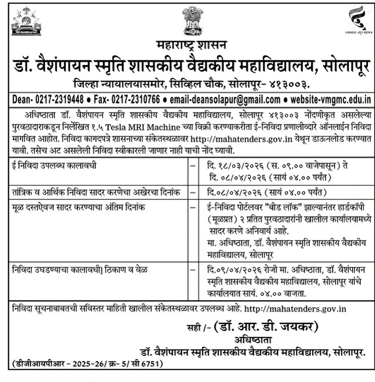 .इच्छुक पुरवठादारांनी ई-निविदा पोर्टलवर ‘बीड लॉक’ केल्यानंतर कागदपत्रांच्या दोन मूळ प्रती (Hard Copies) अधिष्ठाता कार्यालयात जमा करणे अनिवार्य आहे. अटी पूर्ण न करणाऱ्या निविदा स्वीकारल्या जाणार नाहीत, अशी माहिती अधिष्ठाता ऋत्विक जयकर यांनी दिली आहे.. ही निविदा http://mahatenders.gov.in या शासनाच्या संकेतस्थळावर उपलब्ध करण्यात आले आहे अशी ही माहिती त्यांनी दिली आहे