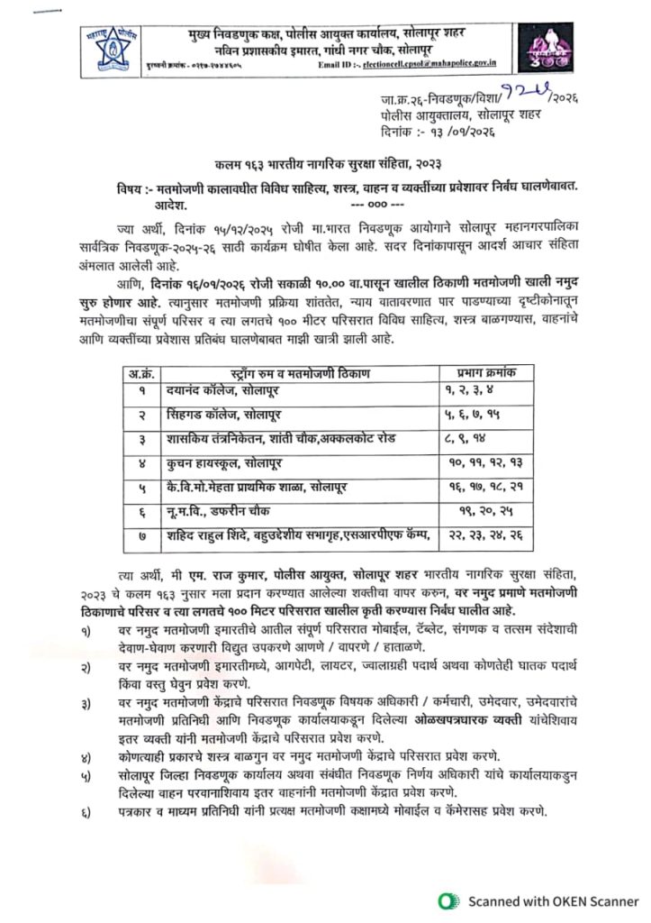 सोलापूर: सोलापूर महानगरपालिका सार्वत्रिक निवडणूक २०२५-२६ ची मतमोजणी दिनांक १६ जानेवारी २०२६ रोजी सकाळी १०.०० वाजेपासून सुरू होणार आहे. ही प्रक्रिया शांततेत आणि निर्भय वातावरणात पार पाडण्यासाठी सोलापूर शहराचे पोलीस आयुक्त एम. राज कुमार यांनी भारतीय नागरिक सुरक्षा संहिता, २०२३ च्या कलम १६३ अन्वये प्रतिबंधात्मक आदेश लागू केले आहेत.