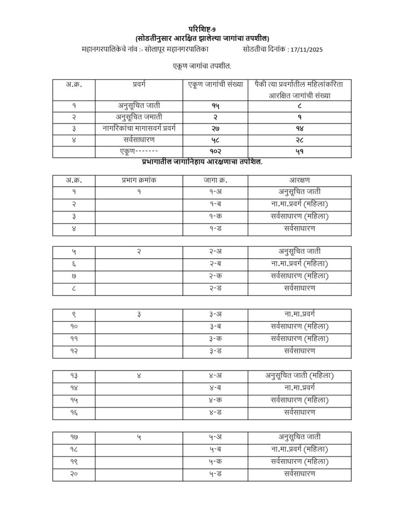 राज्य निवडणूक आयोगाच्या दि. 14/11/2025 चे निर्देशानुसार प्रभाग क्रमांक 3.4.6.7.8.9. 10, 11, 12, 13, 15, 17, 18, 20, 21, 25 या एकूण 16 प्रभागामधून नागरिकांचा मागासप्रवर्ग महिलांसाठी 5 जागा सोडतीने निश्चित करण्यात आल्या त्यात प्रभाग 20, 10, 18, 15, 13 हे पाच थेट महिलेसाठी आरक्षित झाले.