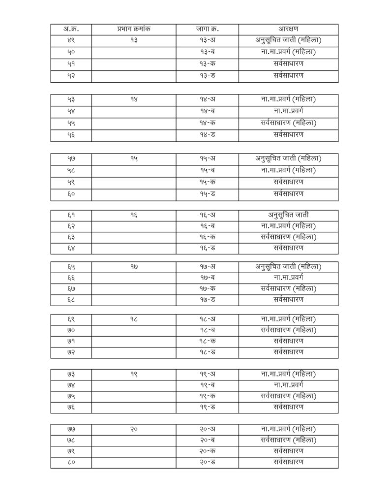या प्रक्रिया दरम्यान नागरिकांच्या मागासप्रवर्ग महिलाकरिता थेट आरक्षित झालेले प्रभाग क्रमांक 1, 2, 5, 16, 22. 23 झाले आहेत. अशाप्रकारे, प्रभाग क्र. 24, 14, 19, 1, 2, 5, 16, 22, 23 हे एकूण 9 प्रभाग नागरिकांचा मागासप्रवर्ग महिलाकरिता थेट आरक्षित झालेले आहे. एकूण 27 नागरिकांचा मागासप्रवर्ग जागा आहेत. यापैकी, 14 जागा या नागरिकांचा मागासप्रवर्ग महिलांकरिता आरक्षित करावयाचा असून यापैकी 9 जागा या नागरिकांचा मागासप्रवर्ग महिलाकरिता थेट आरक्षित झालेले आहेत.