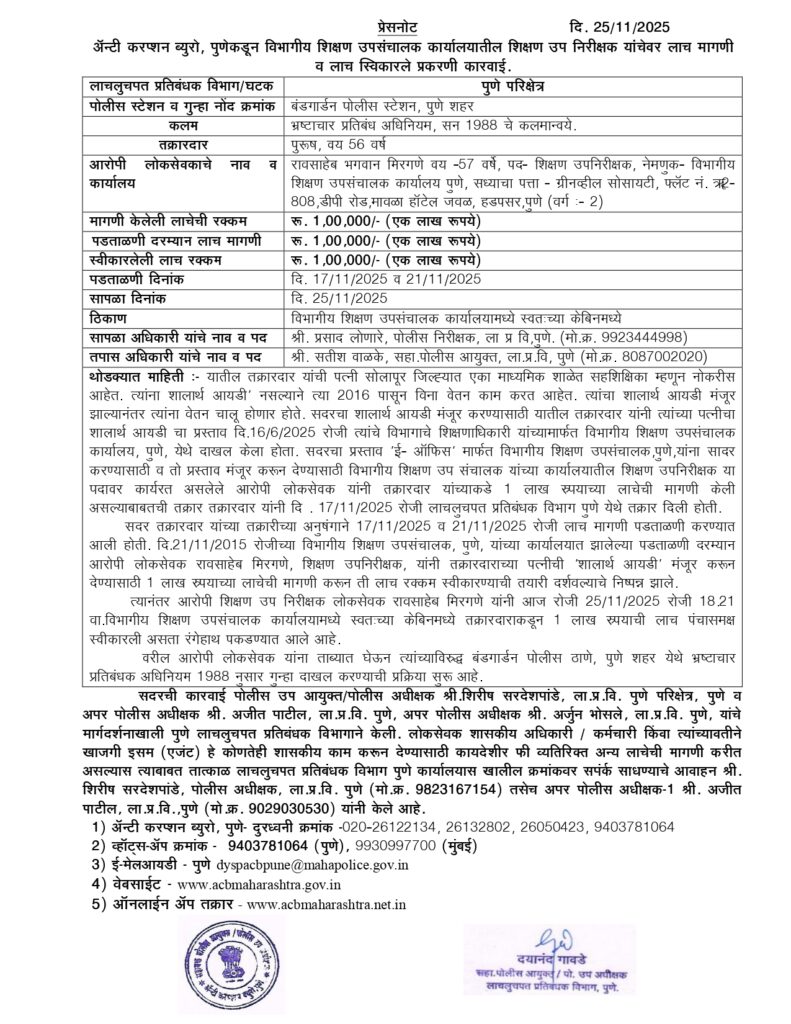 पुणे : थोडक्यात माहिती यातील तक्रारदार यांची पत्नी सोलापूर जिल्ह्यात एका माध्यमिक शाळेत सहशिक्षिका म्हणून नोकरीस आहेत. त्यांना शालार्थ आयडी’ नसल्याने त्या 2016 पासून विना वेतन काम करत आहेत. त्यांचा शालार्थ आयडी मंजूर झाल्यानंतर त्यांना वेतन चालू होणार होते. सदरचा शालार्थ आयडी मंजूर करण्यासाठी यातील तक्रारदार यांनी त्यांच्या पत्नीचा शालार्थ आयडी चा प्रस्ताव दि.16/6/2025 रोजी त्यांचे विभागाचे शिक्षणाधिकारी यांच्यामार्फत विभागीय शिक्षण उपसंचालक कार्यालय, पुणे, येथे दाखल केला होता. सदरचा प्रस्ताव ‘ई- ऑफिस’ मार्फत विभागीय शिक्षण उपसंचालक, पुणे, यांना सादर करण्यासाठी व तो प्रस्ताव मंजूर करून देण्यासाठी विभागीय शिक्षण उप संचालक यांच्या कार्यालयातील शिक्षण उपनिरीक्षक या पदावर कार्यरत असलेले आरोपी लोकसेवक यांनी तक्रारदार यांच्याकडे 1 लाख रुपयाच्या लाचेची मागणी केली असल्याबाबतची तक्रार तक्रारदार यांनी दि. 17/11/2025 रोजी लाचलुचपत प्रतिबंधक विभाग पुणे येथे तक्रार दिली होती.