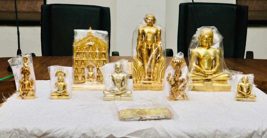 विजापूर रोडवरील रेवणसिध्देश्वर मंदिरासमोरील दानम्मा देवी मंदिर आणि मंत्री चंडक पार्कसमोर असलेल्या बाहुबली नगर येथील बाहुबली जैन मंदिरामध्ये चोरट्यांनी चोरी केली होती. दानम्मा देवी मंदिरातील दानपेटी फोडून सुमारे ६ हजार रुपयांची रक्कम चोरून नेण्यात आल्याप्रकरणी मंदिराचे पुजारी सिध्दय्या भद्रय्या हिरेमठ (वय ५५, रा. गणेश नगर, विजापूर रोड, सोलापूर) यांनी दिलेल्या फिर्यादीवरुन सदर बझार पोलीस ठाण्यात गुन्हा दाखल करण्यात आला आहे. मंदिरात चोरी करतानाचे गुन्हेगार हे मंदिरातील सीसीटीव्ही कॅमेऱ्यांमध्ये कैद झाले होते. या गुन्ह्यांचा तपास करताना शहर गुन्हे शाखेच्या पोलिसांनी सीसीटीव्ही कॅमेऱ्याच्या चित्रीकरणातील गुन्हेगारांची पाहणी करून आरोपींची ओळख पटविली. चित्रीकरणातील गुन्हेगार हे सराईत असल्याचे दिसून आल्यानंतर पोलिसांनी खबऱ्यांना कामाला लावले. आरोपी हे मोदी रेल्वे बोगदा येथे येणार असल्याची माहिती पोलीस पथकास मिळाल्यानंतर पोलिसांनी त्याठिकाणी सापळा लावून आकाश पवार व अश्पाक शेख या दोघांना ताब्यात घेतले. त्यांच्याकडे असलेल्या पिशवीमध्ये देव-देवतांच्या पंचधातूच्या ८ मूर्ती व रोख २ हजार रुपये मिळून आले. ताब्यात घेतलेल्या दोघांकडे चौकशी केल्यानंतर त्यांनी त्यांचा साथीदार करण्या केंगार याच्या मदतीने मंदिरात चोरी केल्याचे सांगितले.