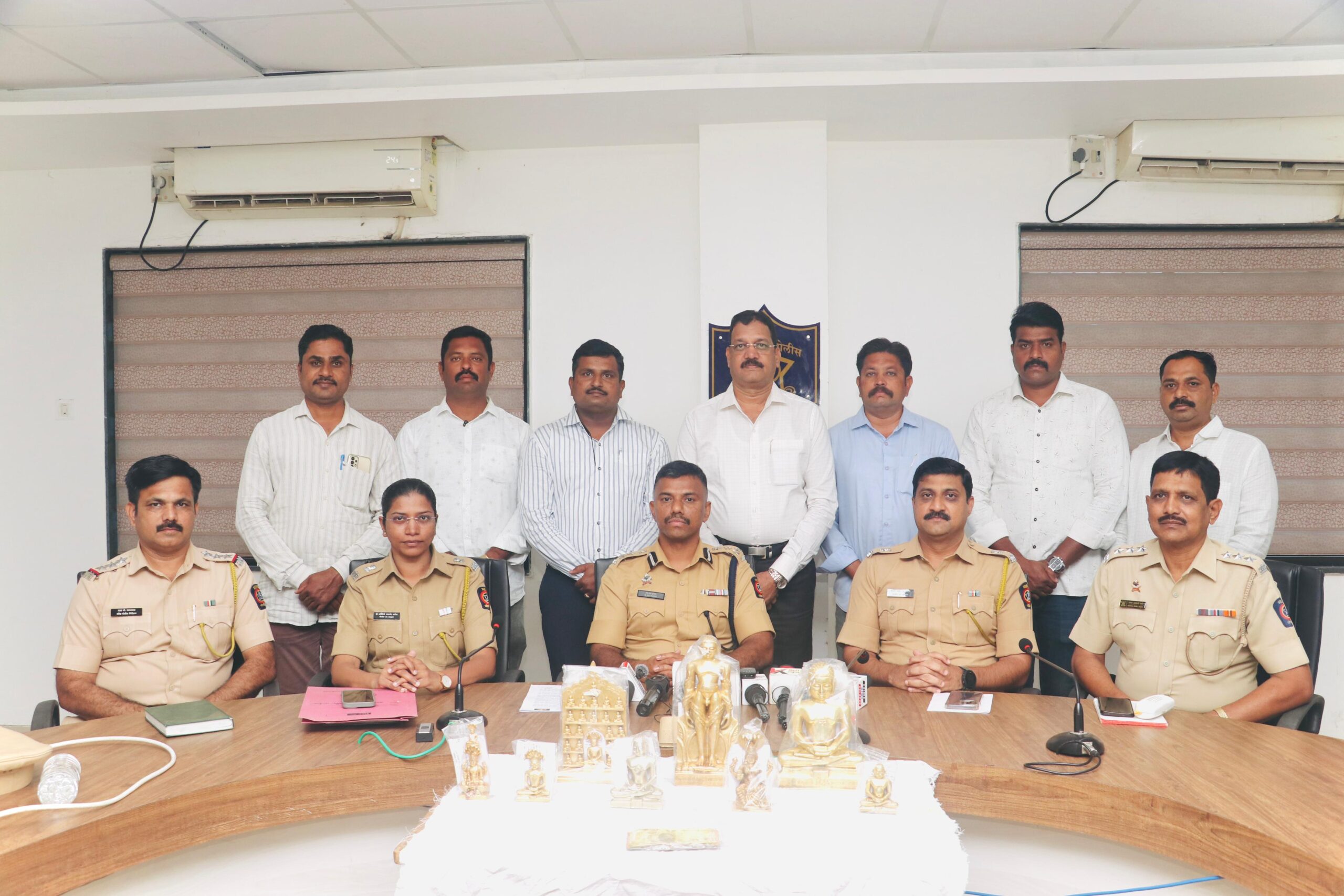 विजापूर रोडवरील रेवणसिध्देश्वर मंदिरासमोरील दानम्मा देवी मंदिर आणि मंत्री चंडक पार्कसमोर असलेल्या बाहुबली नगर येथील बाहुबली जैन मंदिरामध्ये चोरट्यांनी चोरी केली होती. दानम्मा देवी मंदिरातील दानपेटी फोडून सुमारे ६ हजार रुपयांची रक्कम चोरून नेण्यात आल्याप्रकरणी मंदिराचे पुजारी सिध्दय्या भद्रय्या हिरेमठ (वय ५५, रा. गणेश नगर, विजापूर रोड, सोलापूर) यांनी दिलेल्या फिर्यादीवरुन सदर बझार पोलीस ठाण्यात गुन्हा दाखल करण्यात आला आहे. मंदिरात चोरी करतानाचे गुन्हेगार हे मंदिरातील सीसीटीव्ही कॅमेऱ्यांमध्ये कैद झाले होते. या गुन्ह्यांचा तपास करताना शहर गुन्हे शाखेच्या पोलिसांनी सीसीटीव्ही कॅमेऱ्याच्या चित्रीकरणातील गुन्हेगारांची पाहणी करून आरोपींची ओळख पटविली. चित्रीकरणातील गुन्हेगार हे सराईत असल्याचे दिसून आल्यानंतर पोलिसांनी खबऱ्यांना कामाला लावले. आरोपी हे मोदी रेल्वे बोगदा येथे येणार असल्याची माहिती पोलीस पथकास मिळाल्यानंतर पोलिसांनी त्याठिकाणी सापळा लावून आकाश पवार व अश्पाक शेख या दोघांना ताब्यात घेतले. त्यांच्याकडे असलेल्या पिशवीमध्ये देव-देवतांच्या पंचधातूच्या ८ मूर्ती व रोख २ हजार रुपये मिळून आले. ताब्यात घेतलेल्या दोघांकडे चौकशी केल्यानंतर त्यांनी त्यांचा साथीदार करण्या केंगार याच्या मदतीने मंदिरात चोरी केल्याचे सांगितले.