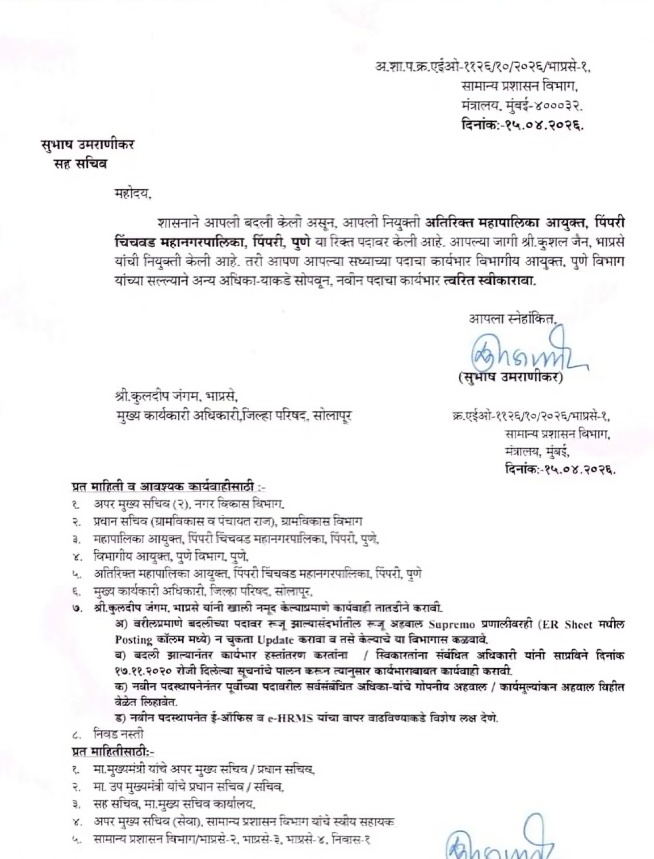 सोलापूर जिल्हा परिषदेत आपल्या कार्यशैलीने ठसा उमटवणारे कुलदीप जंगम यांची पदोन्नतीने किंवा प्रशासकीय बदलीने आता पिंपरी-चिंचवड महानगरपालिकेच्या ‘अपर आयुक्त’ (Additional Commissioner) पदी नियुक्ती करण्यात आली आहे. पिंपरी-चिंचवडसारख्या महत्त्वाच्या औद्योगिक शहरात त्यांच्यावर आता मोठी जबाबदारी सोपवण्यात आली आहे.