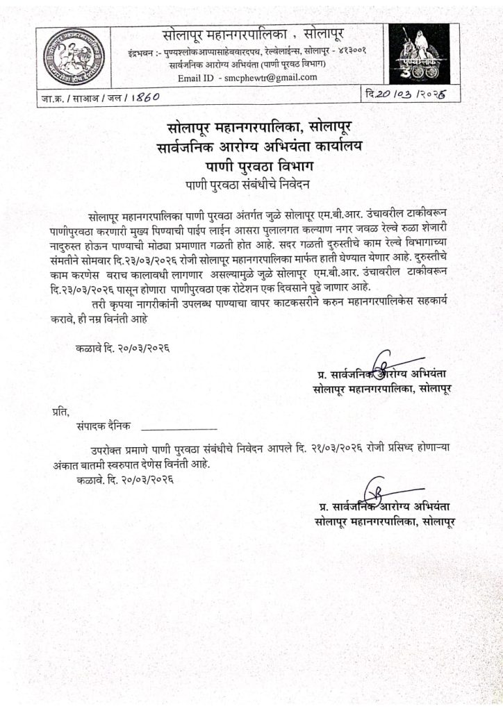 सोलापूर: सोलापूर महानगरपालिका पाणीपुरवठा विभागांतर्गत येणाऱ्या जुळे सोलापूर एम.बी.आर. उंचावरील टाकीची मुख्य जलवाहिनी आसरा पुलाजवळ कल्याण नगर येथे रेल्वे रुळाशेजारी फुटली आहे. या गळतीमुळे मोठ्या प्रमाणावर पाणी वाया जात असून, दुरुस्तीचे काम रेल्वे विभागाच्या संमतीने सोमवार, दिनांक २३/०३/२०२६ रोजी हाती घेण्यात येणार आहे.