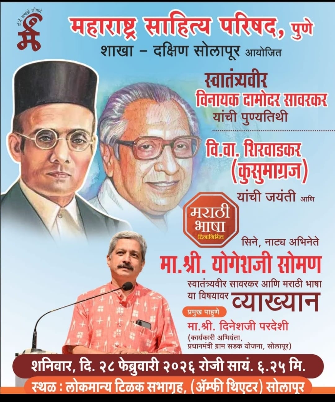 सोलापूर: महाराष्ट्र साहित्य परिषद, पुणे (शाखा – दक्षिण सोलापूर) यांच्या वतीने आगामी २८ फेब्रुवारी रोजी एका विशेष व्याख्यानाचे आयोजन करण्यात आले आहे. स्वातंत्र्यवीर विनायक दामोदर सावरकर यांची पुण्यतिथी आणि कविवर्य वि. वा. शिरवाडकर (कुसुमाग्रज) यांची जयंती तसेच ‘मराठी भाषा गौरव दिना’चे औचित्य साधून हा कार्यक्रम पार पडणार आहे.