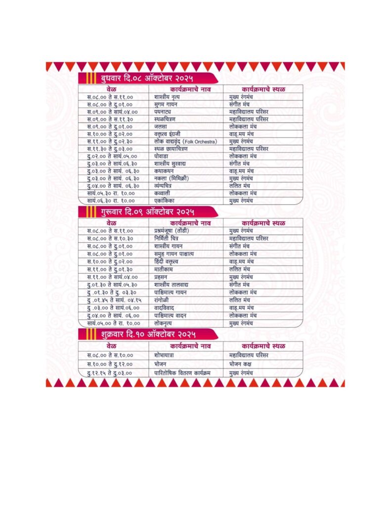 दि. 7 ते 10 ऑक्टोबर 2025 या कालावधीत नृत्य, नाट्य, लोककला, ललित, वांग्मय, संगीत विभागातील एकूण 39 कलाप्रकारांचे सादरीकरण या युवा महोत्सवात होणार आहे. सुमारे 60 महाविद्यालये आणि जवळपास 1600 विद्यार्थी कलाकारांचा यामध्ये सहभाग राहणार आहे. युवा महोत्सवाच्या पहिल्या दिवशी मंगळवार, दि. 7 ऑक्टोबर 2025 रोजी सकाळी आठ वाजता नोंदणी, उद्घाटन सोहळा, संघ व्यवस्थापकांची बैठक, लावणी, समूह गायन (भारतीय), कातरकाम, मूक अभिनय, प्रश्नमंजुषा (लेखी), वक्तृत्व मराठी, भारुड, काव्यवाचन, भित्तीचित्रण, मेहंदी, भजन आणि एकांकिकेचे सादरीकरण होणार आहे.
