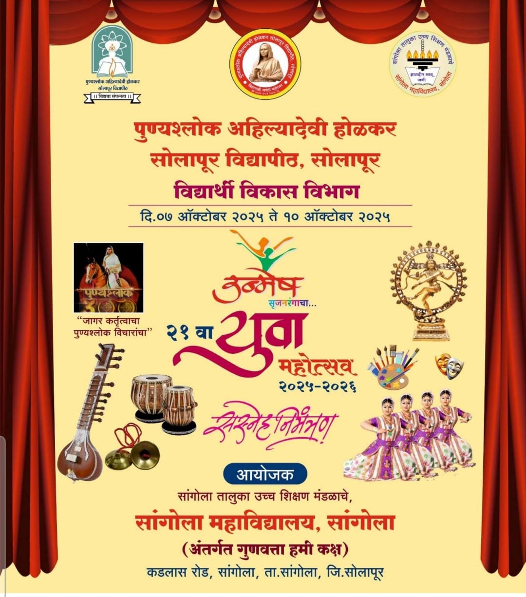 सोलापूर, दि. 4- पुण्यश्लोक अहिल्यादेवी होळकर सोलापूर विद्यापीठाचा 21 वा उन्मेश सृजनरंगाचा युवा महोत्सव सांगोला महाविद्यालय सांगोला येथे होणार असून मंगळवार, दि. 7 ऑक्टोबर 2025 रोजी सकाळी दहा वाजता मान्यवरांच्या उपस्थितीत उद्घाटन सोहळा पार पडणार असल्याची माहिती विद्यार्थी विकास विभागाचे संचालक डॉ. केदारनाथ काळवणे यांनी दिली.